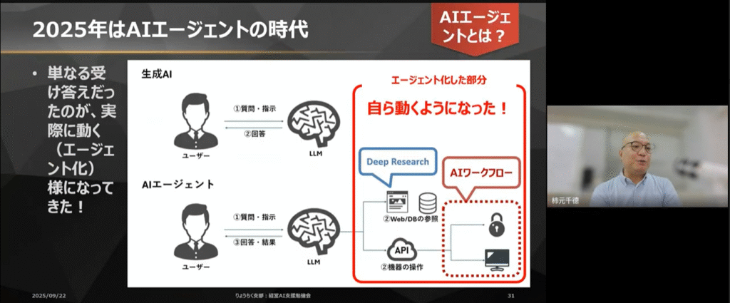 この記事では、先日開催された久留米市東部、うきは市、朝倉市を基盤とする筑後地方北部の、福岡県中小企業家同友会りょうちく支部主宰の中小零細企業経営者向けAI勉強会で共有された最先端の知見をもとに、AIの新たな潮流である「AIエージェント」が、いかにしてあなたのビジネスを変革し、業務効率化を加速させるかをご紹介します。