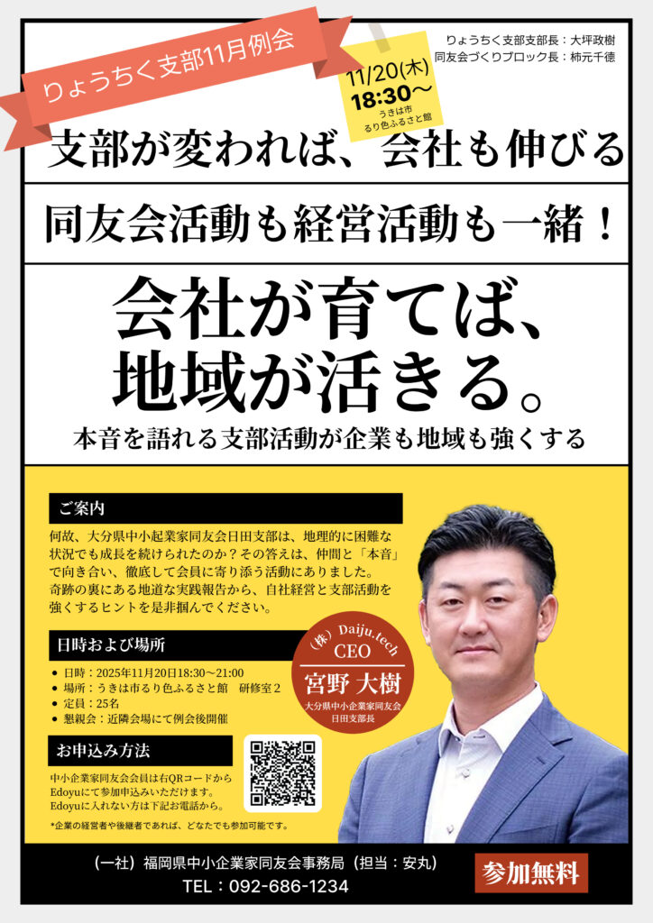 (一社)福岡県中小企業家同友会りょうちく支部では、2025年11月20日(木)に「会社が育てば、地域が活きる。~本音を語れる支部活動が企業も地域も強くする~」をテーマにした11月例会を開催いたします。