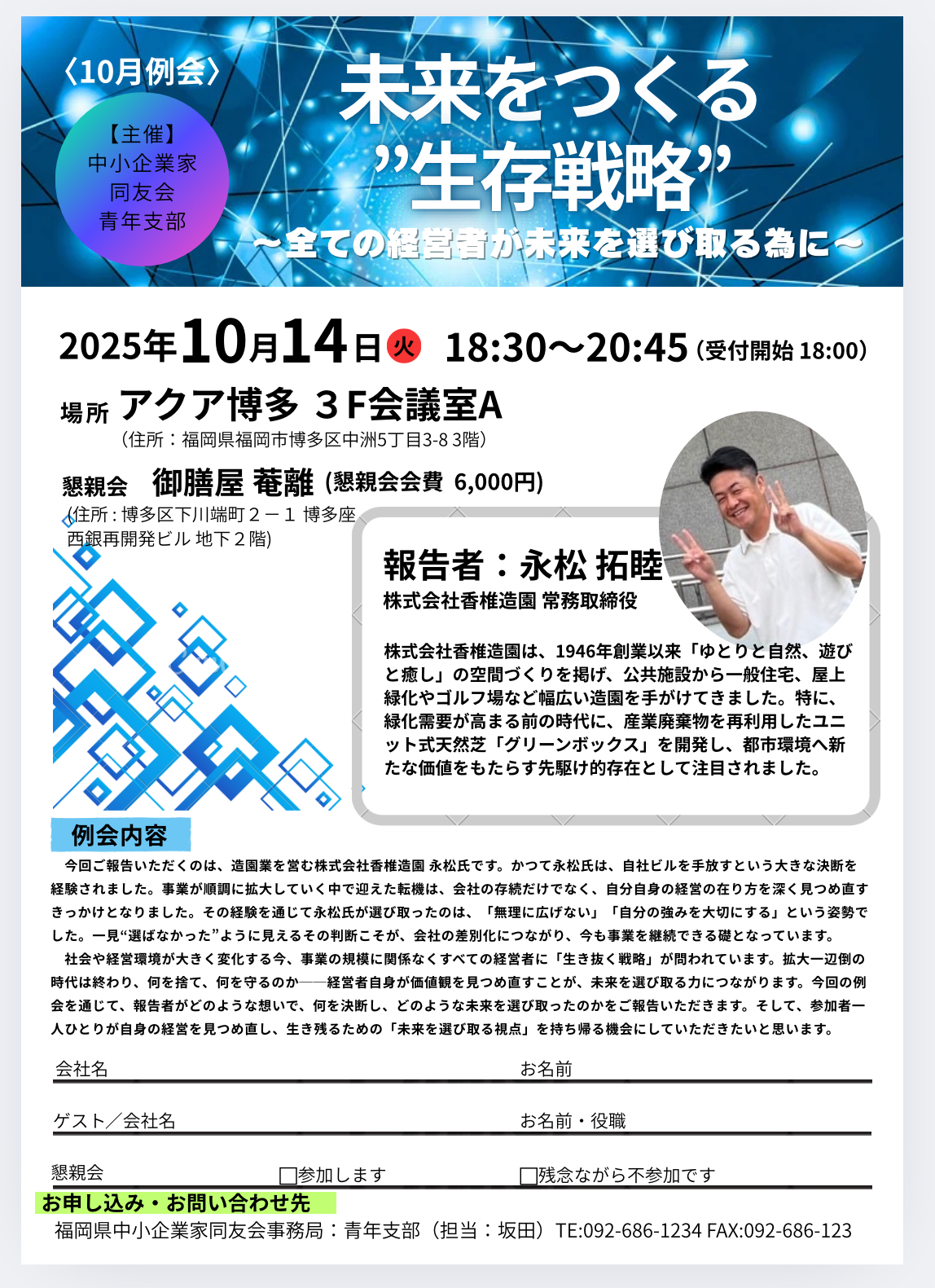 今回ご報告いただくのは、造園業を営む株式会社香椎造園 永松氏です。かつて永松氏は、自社ビルを手放すという大きな決断を経験されました。事業が順調に拡大していく中で迎えた転機は、会社の存続だけでなく、自分自身の経営の在り方を深く見つめ直すきっかけとなりました。その経験を通じて永松氏が選ばったのは、「無理に広げない」「自分の強みを大切にする」という姿勢でした。一見“選ばなかった”ように見えるその判断こそが、会社の差別化につながり、今も事業を継続できる礎となっています。